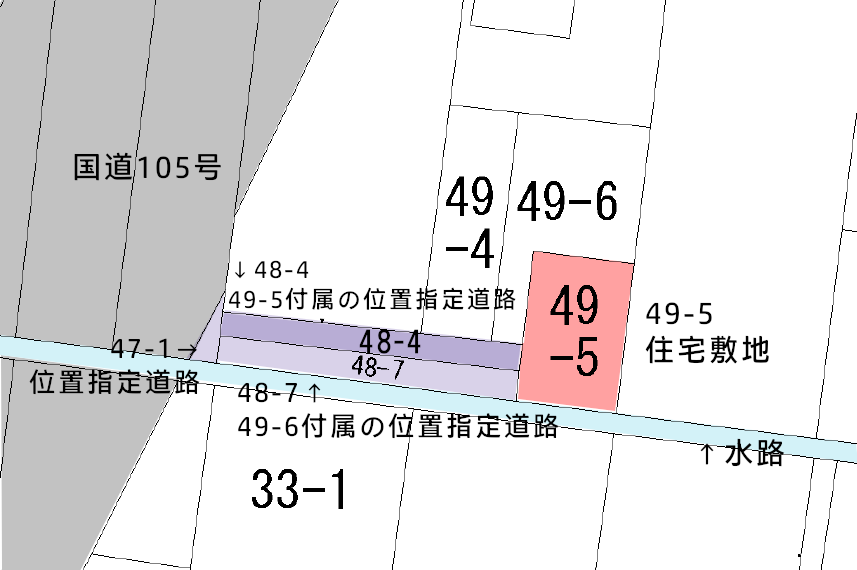 | 接道状況 | 1方向: 川口字八幡前49-5から48-4(位置指定道路)へ接道 川口字八幡前48-4から国道105号へ接道 |