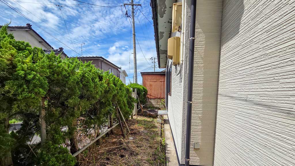金浦の町の北側で、駅から800mのところにあります。秋田県民はみな車移動なのですが、金浦のマックスバリュまで徒歩で行ける距離ではあります。土地の裏側は神社がある山で、静かな住宅街です。