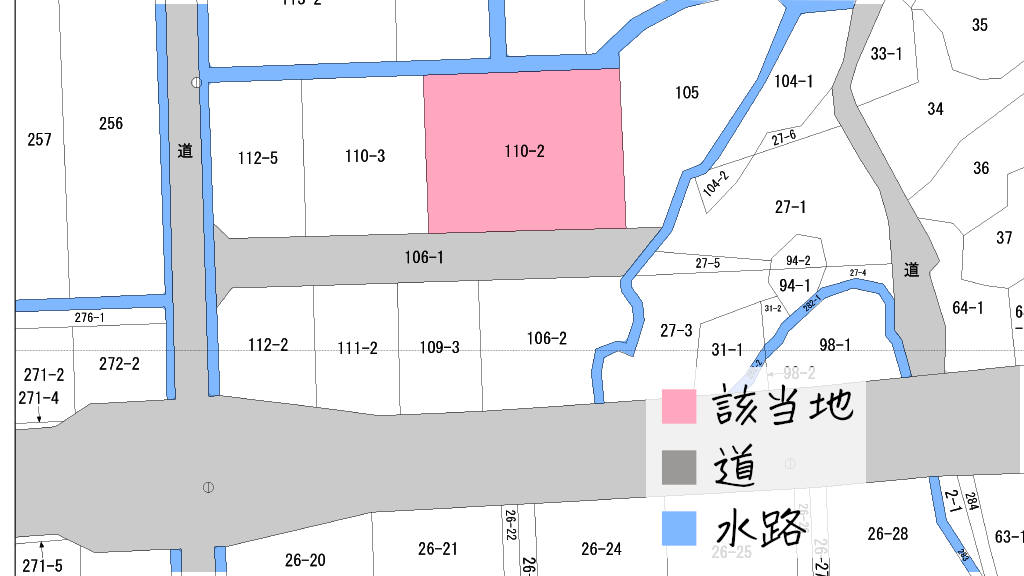 地積測量図がないので公図から測った長さですが、南側間口23.8m、奥行き19.2mの使いやすい比率の整形地です。