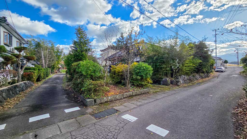 前面道路は地番なしの「道」で、幅員はあまり太くはないですがにかほ市の市道です。