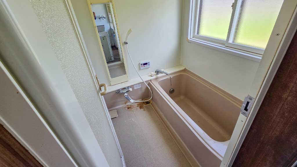 お風呂はユニットバスではありますが、ボイラやオイルタンクも撤去しているため、住宅や民泊として使用する場合などは洗濯脱衣室と合わせてリノベが必要になるとお考え下さい。