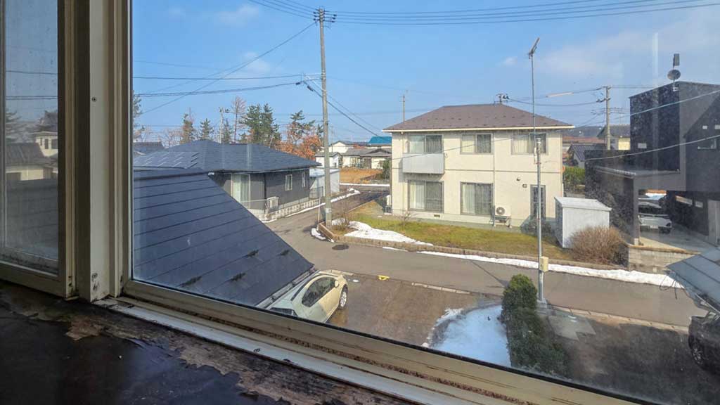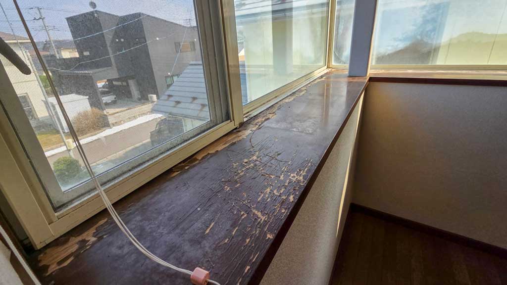 他、南側居間の大きな掃き出し窓の上のところから雨漏り・雨染みがあったことがあり、外部のその位置をコーキングでふさいであります。